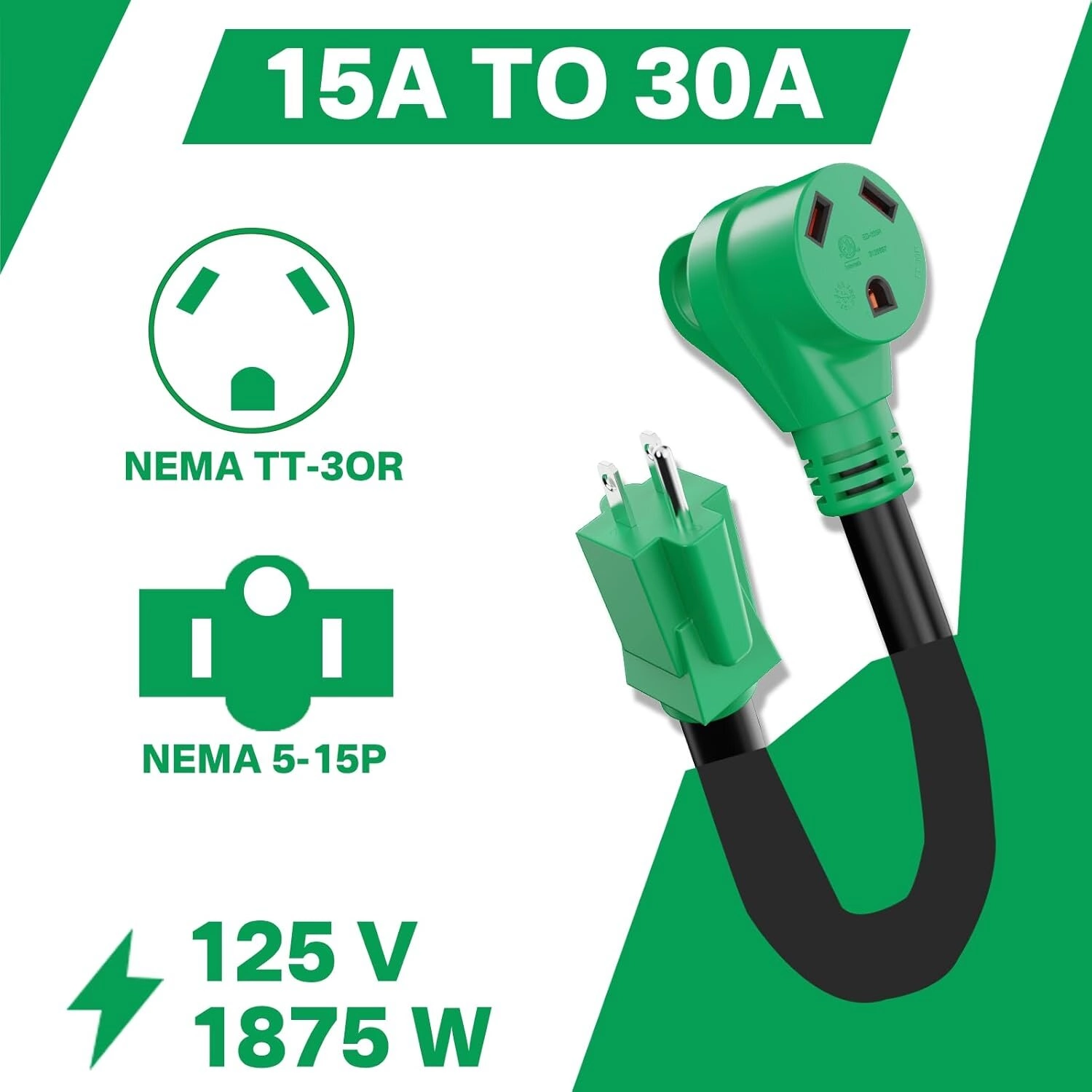 Convert a standard 15A household outlet into a 30A RV-ready power source. Perfect for charging batteries or powering low-wattage appliances when your RV is parked at home or in a limited-power campsite.