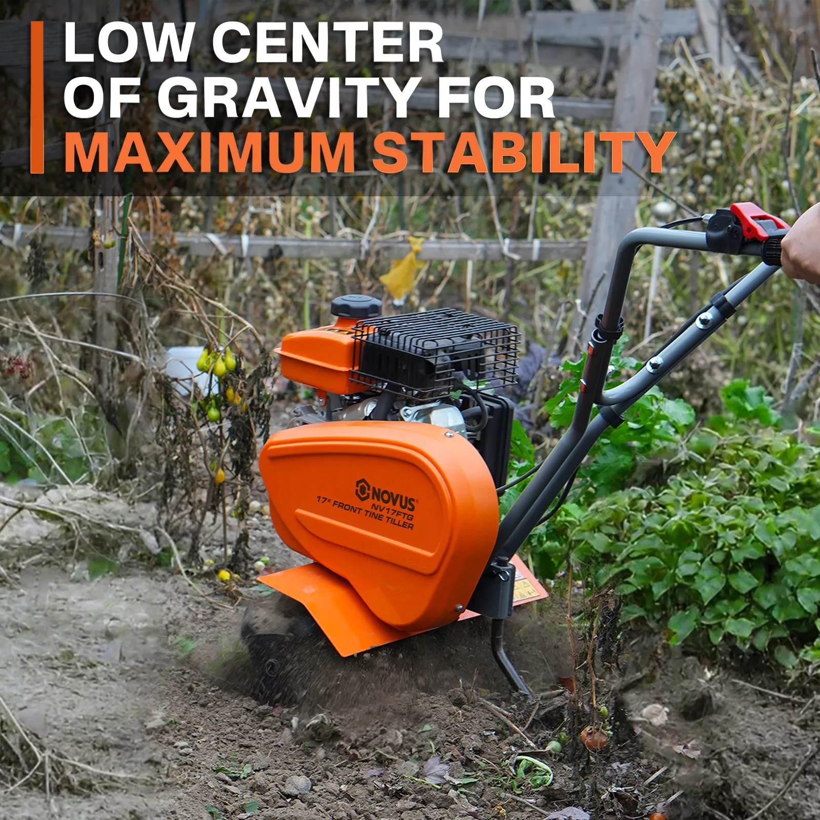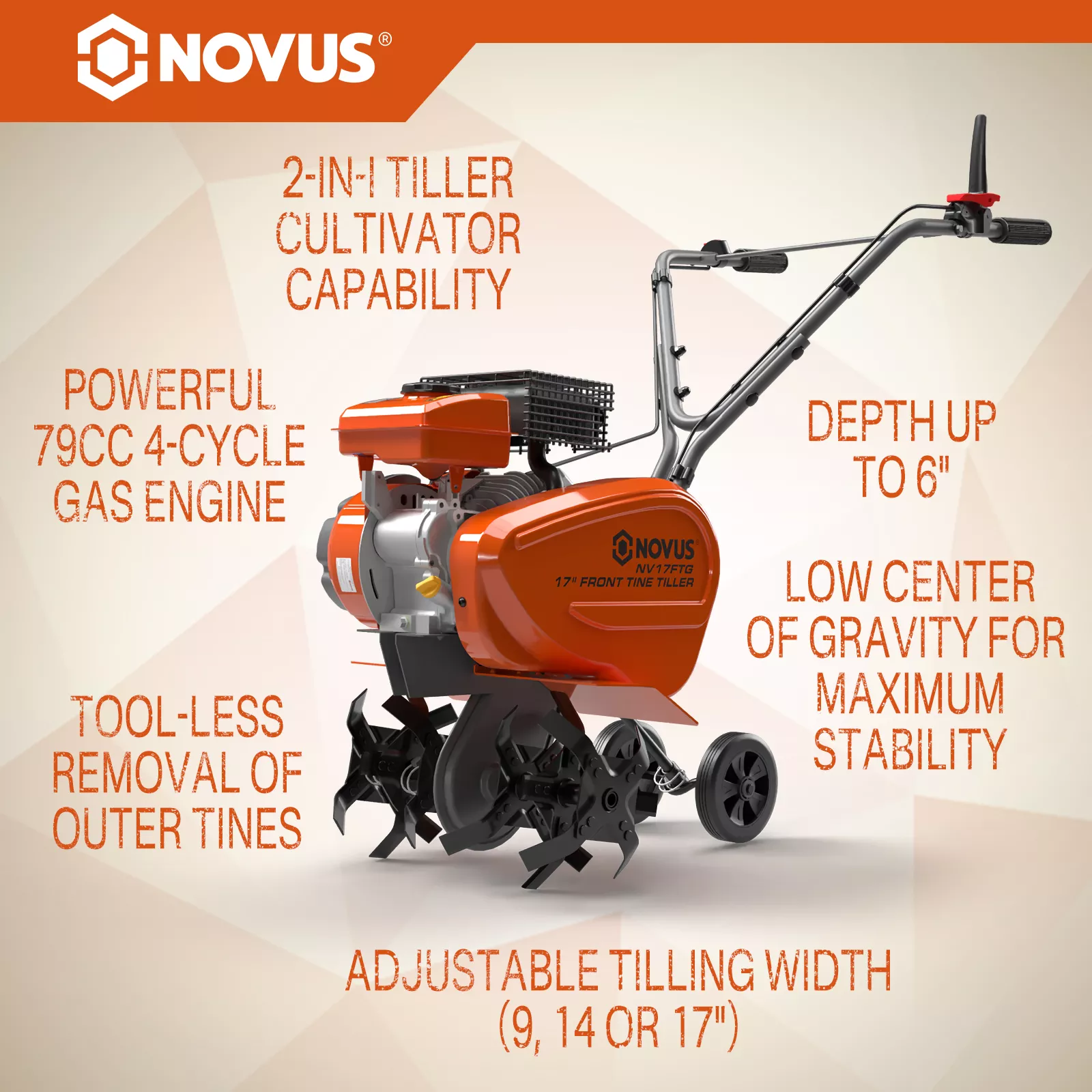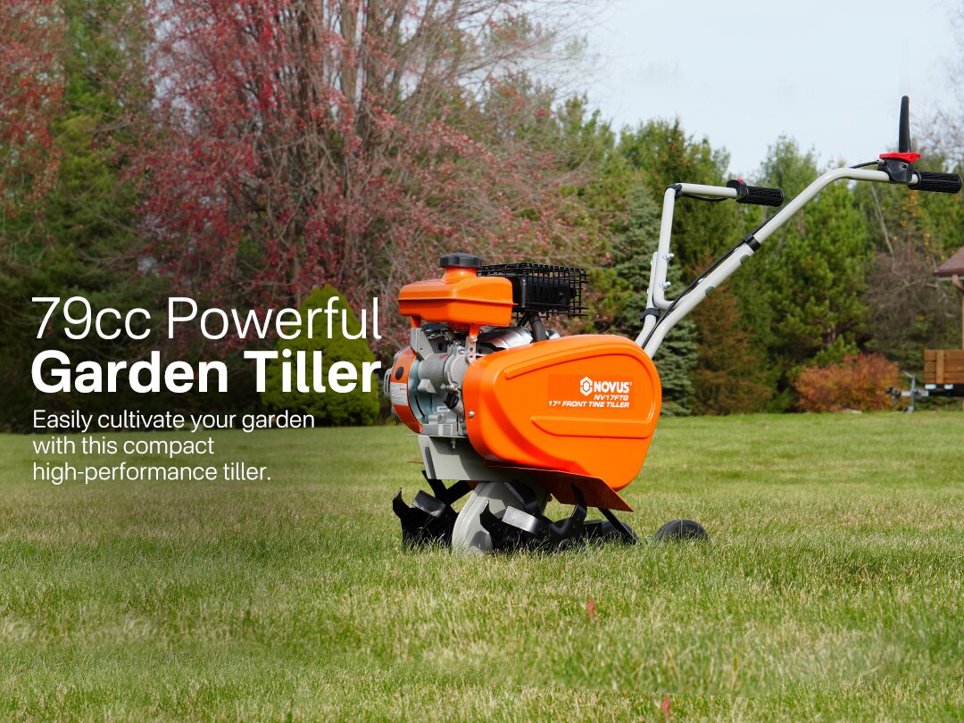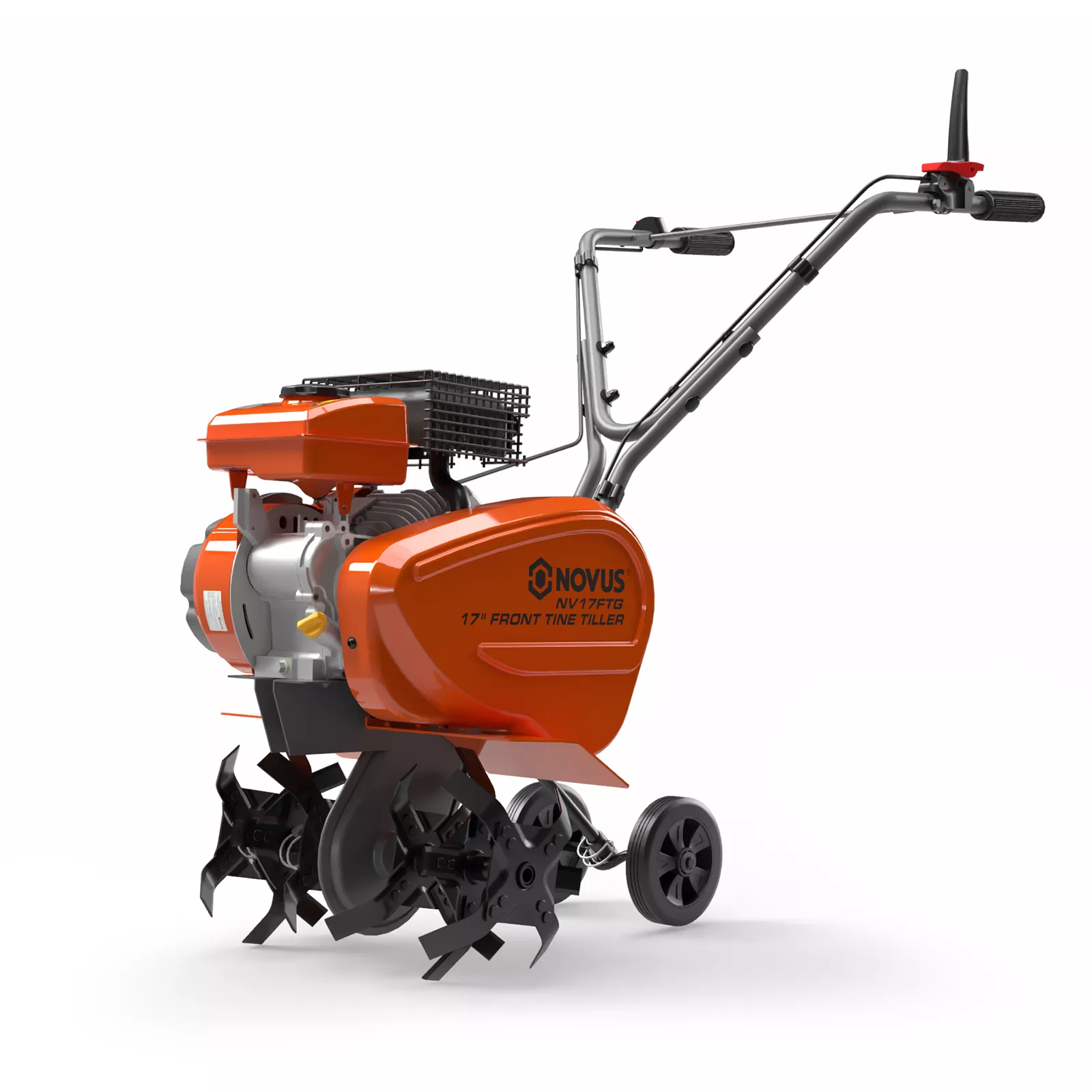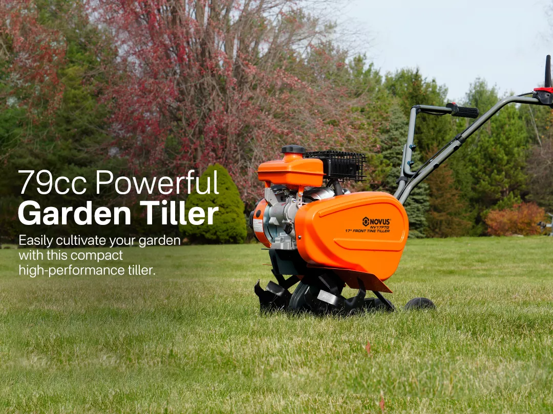 This NOVUS 17″ front tine tiller is a compact but yet highly capable tiller. Designed for the residential gardener, this machine is easy to maneuver and control. Powered by an easy to start 79cc OHV engine, you will have no shortage of power to break up the toughest of ground.