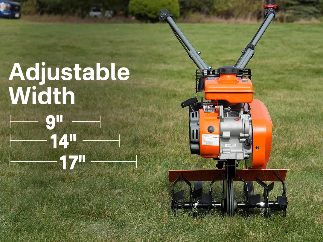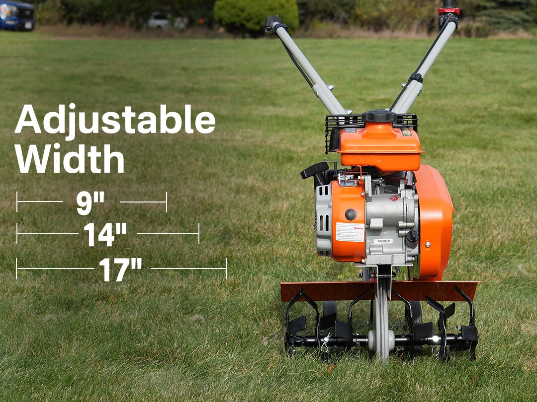 - Tool-less adjustable tilling width between 9″, 14″, 17″