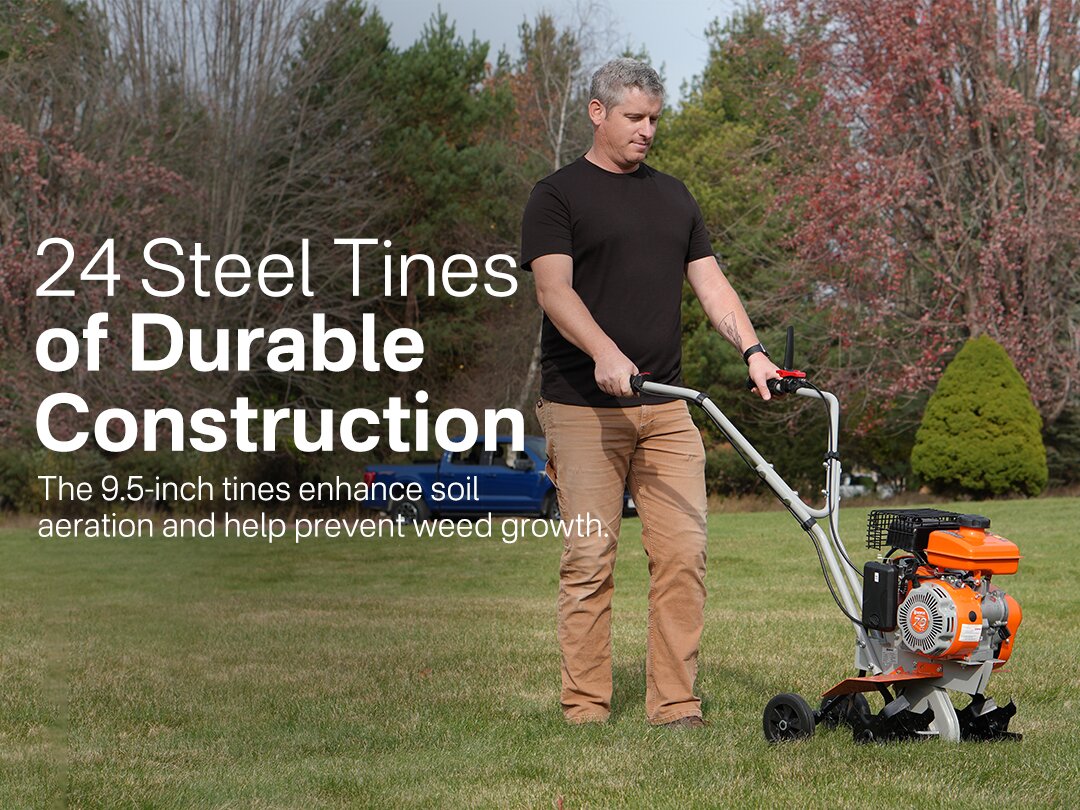 24 pieces 9.5-inch heavy-duty hardened steel tines with double-edged make it easy to till narrow spaces or wide rows.