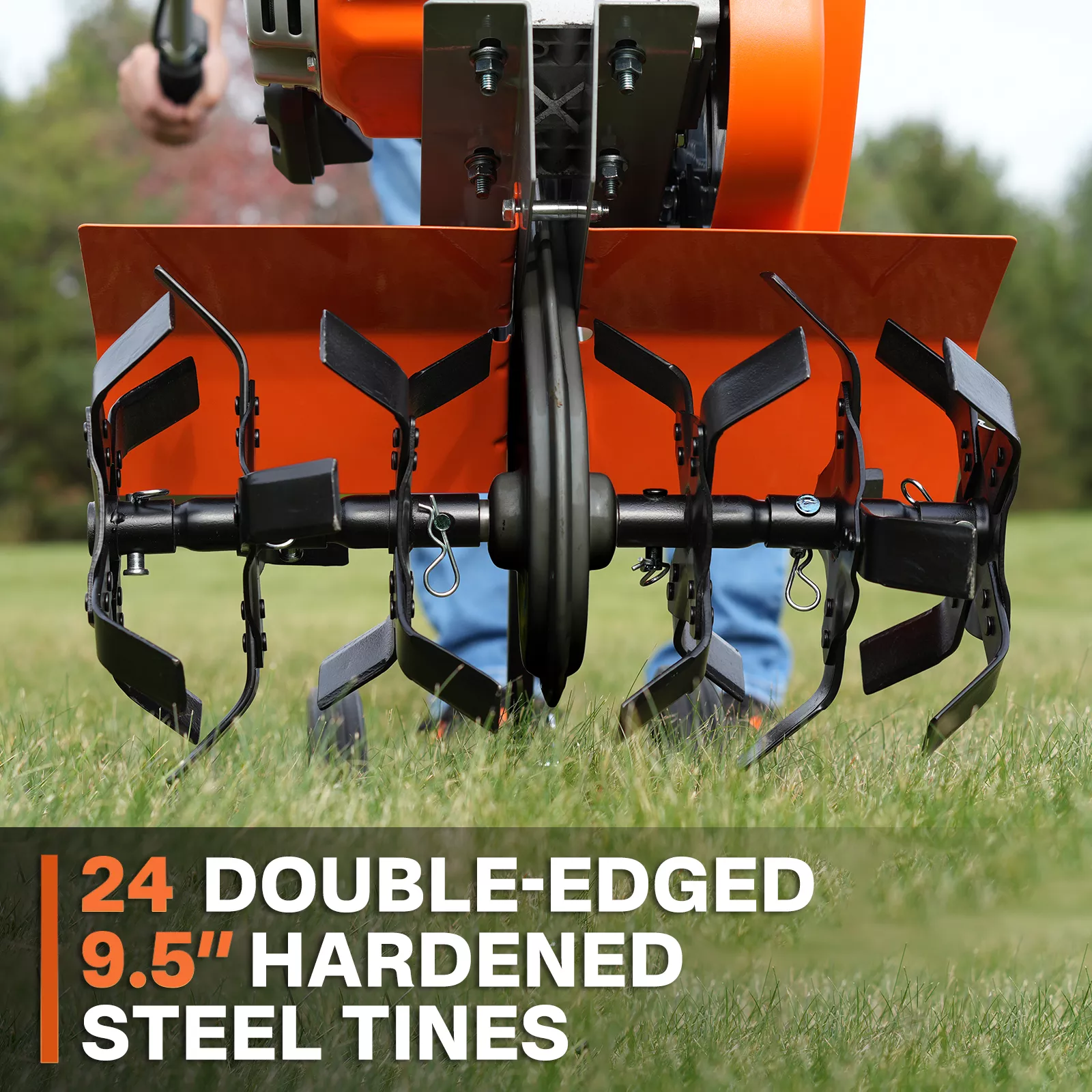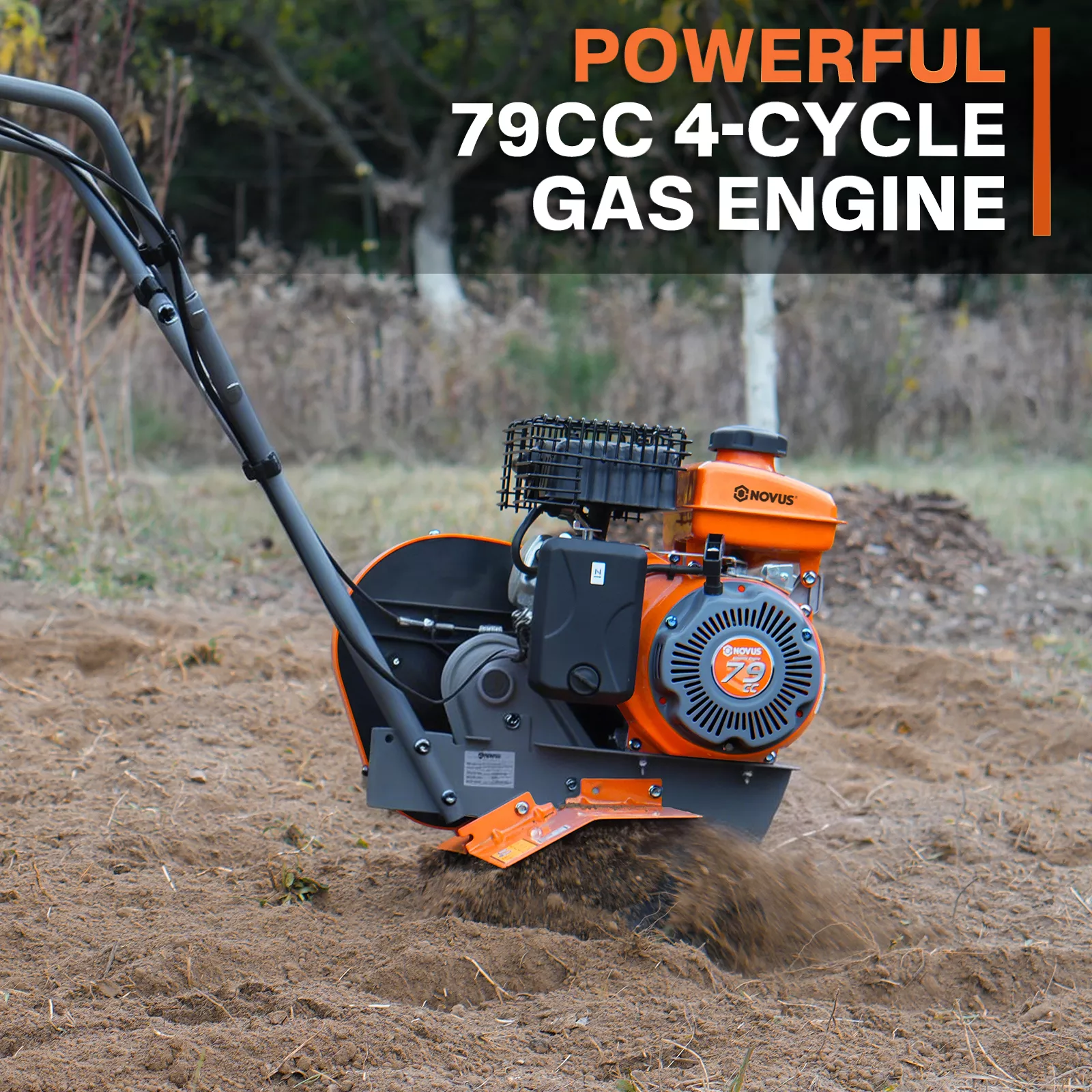 A high performance and fuel efficient 4-stroke 79cc gas engine starts up easily with a smooth pull recoil and delivers plenty of power to till through all kinds of soil conditions.