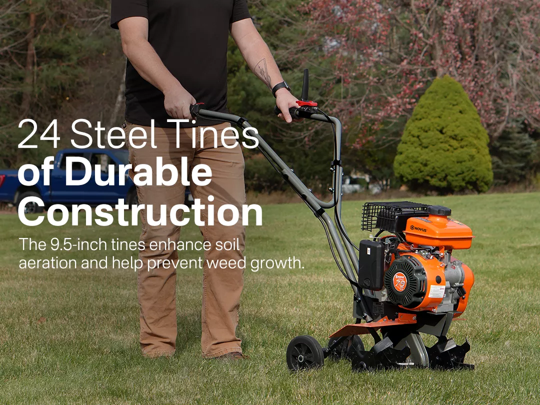 With tool-free removal of outer tines, the NOVUS tilling tool quickly transforms from a garden tiller into a powerfull cultivator. It offers adjustable tilling widths of 9, 14, or 17 inches and a maximum tilling depth of 6 inches, perfect for various gardening tasks