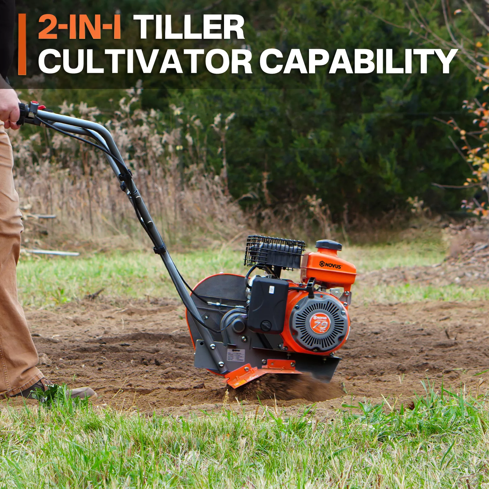 Tool-less removal of outer tines quickly turns the NOVUS 2-in-1 from a tiller into a cultivator with tilling widths of 9, 14 or 17 inches and a max tilling depth of 6 inches.
