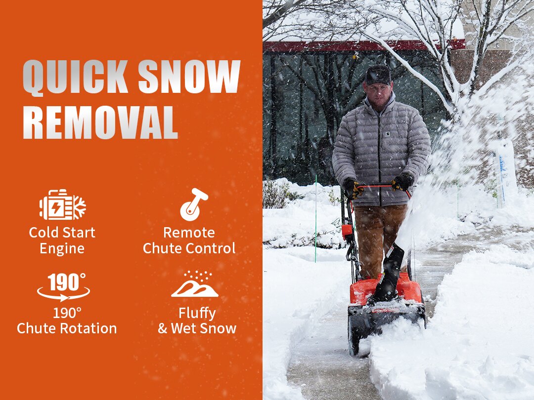 Featuring a one-hand 190° remote chute control that allows you to effortlessly direct the snow discharge, making clean-up easier.