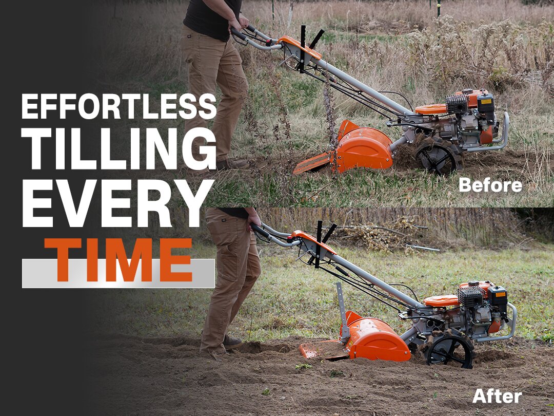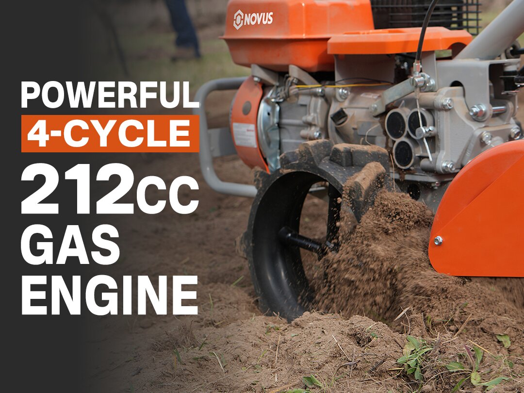 The 4-STROKE 212cc gas engine provides the power to transform the toughest ground into perfect planting soil.