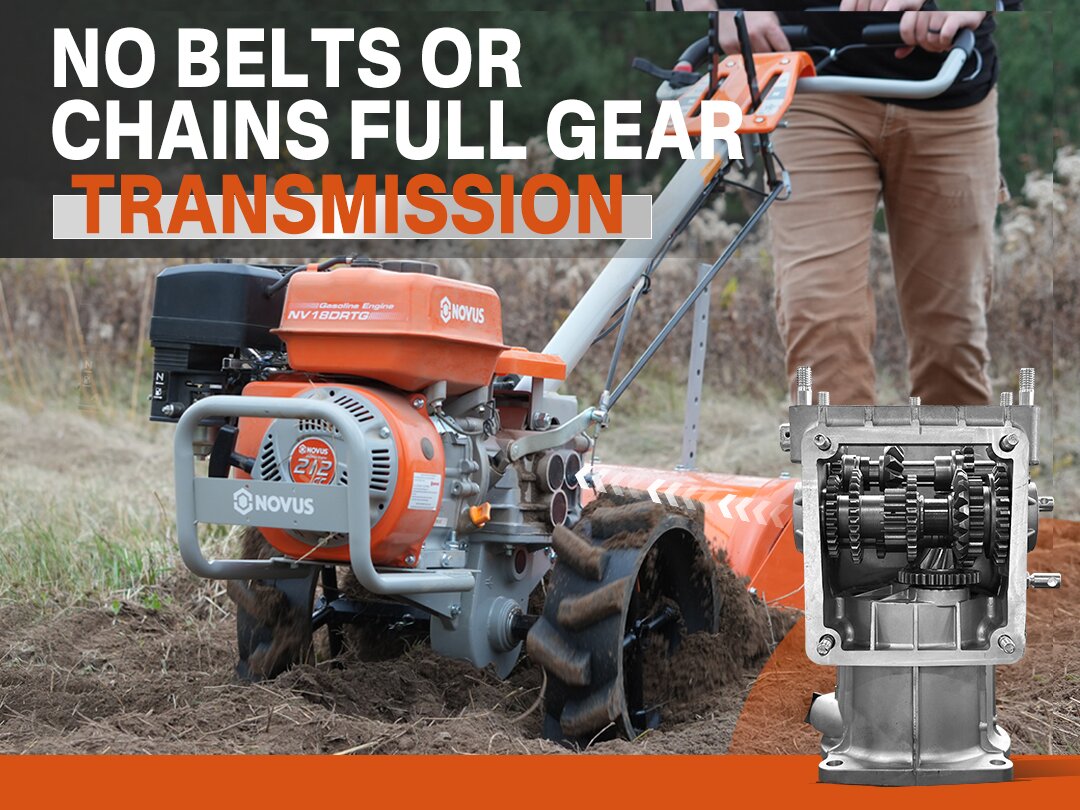 Unlike other tillers that use belt drive systems, ours utilizes a full gear drive. This not only ensures low maintenance and long life but also enhances efficiency and reliability.
