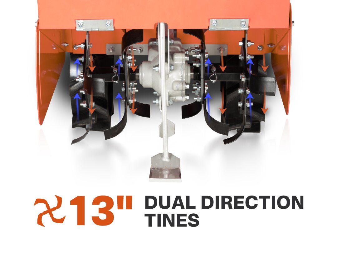 Powered by a 212cc engine, this machine delivers superior efficiency, reliability, and performance to handle any job. Equipped with bi-directional tines, you can easily switch between forward and counter-rotating direction without changing the tine direction.