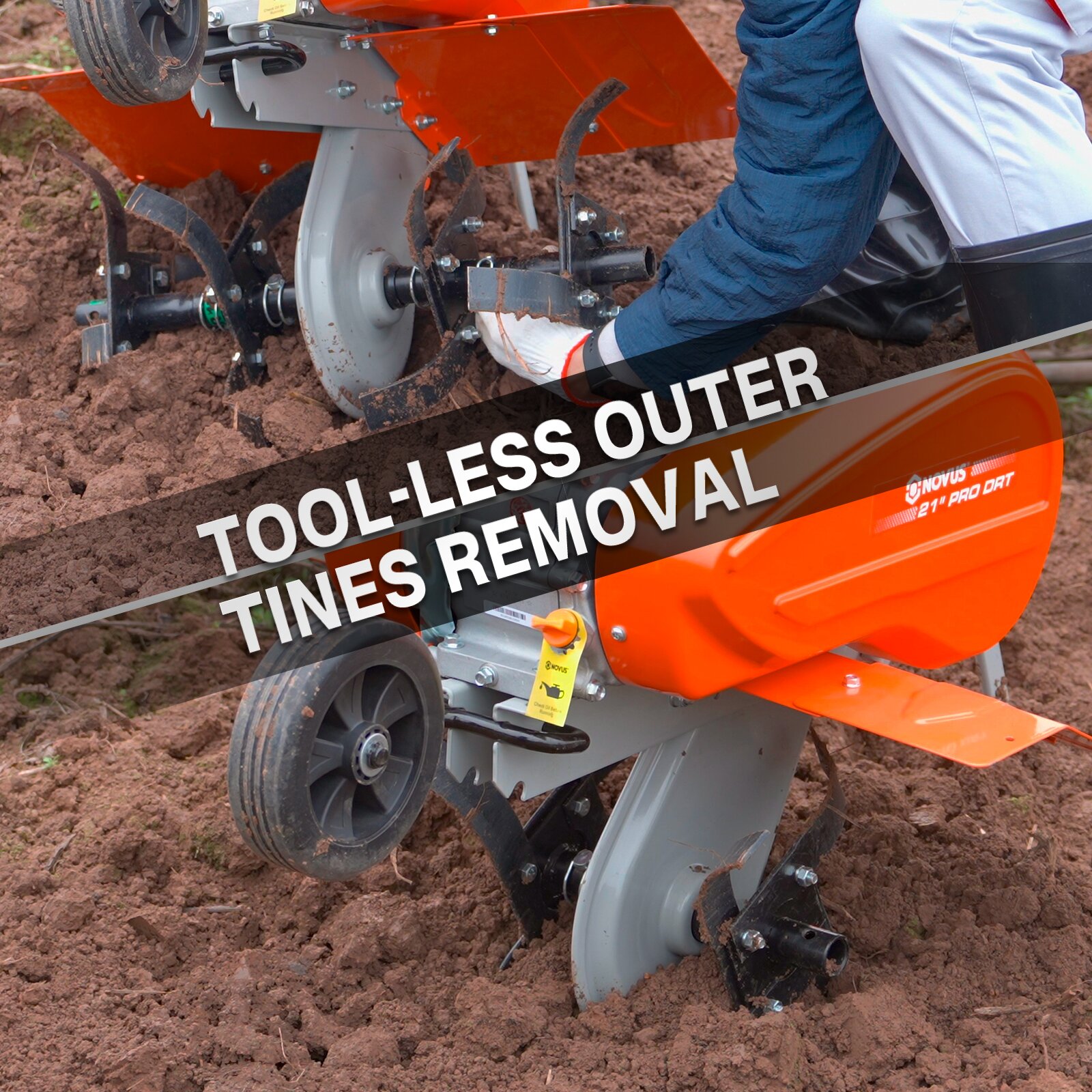 Tool-less removal of outer tines, 16 pcs 12.4-inch heavy-duty hardened steel tines make it easy to till narrow spaces or wide rows.