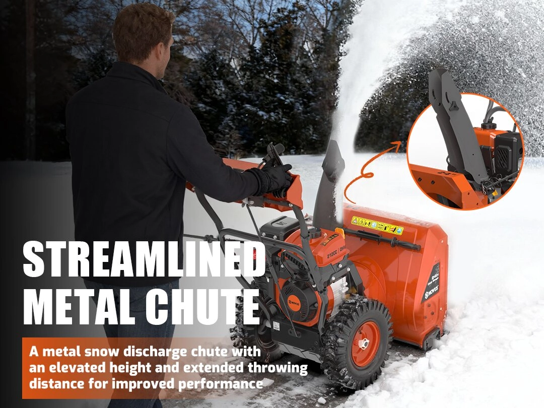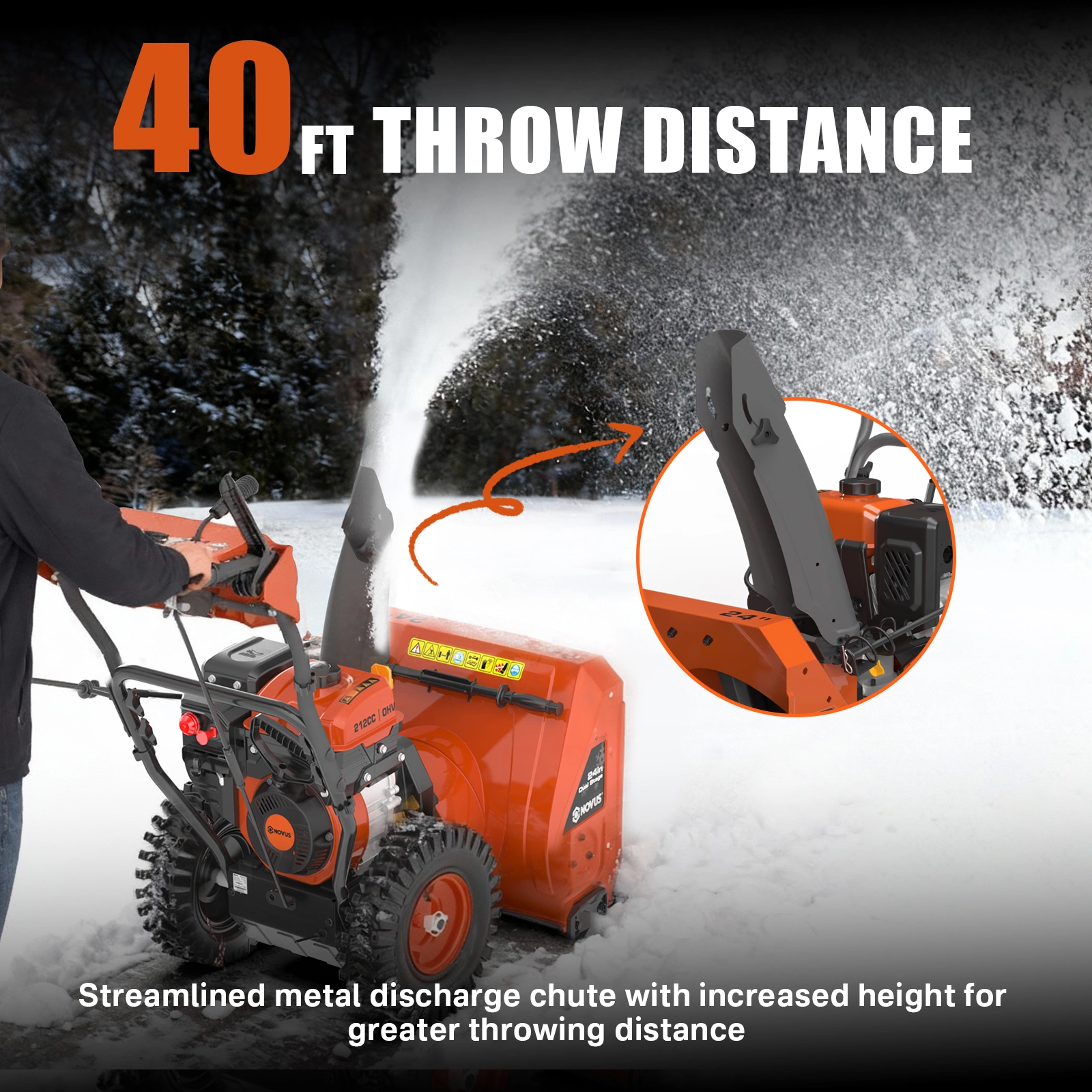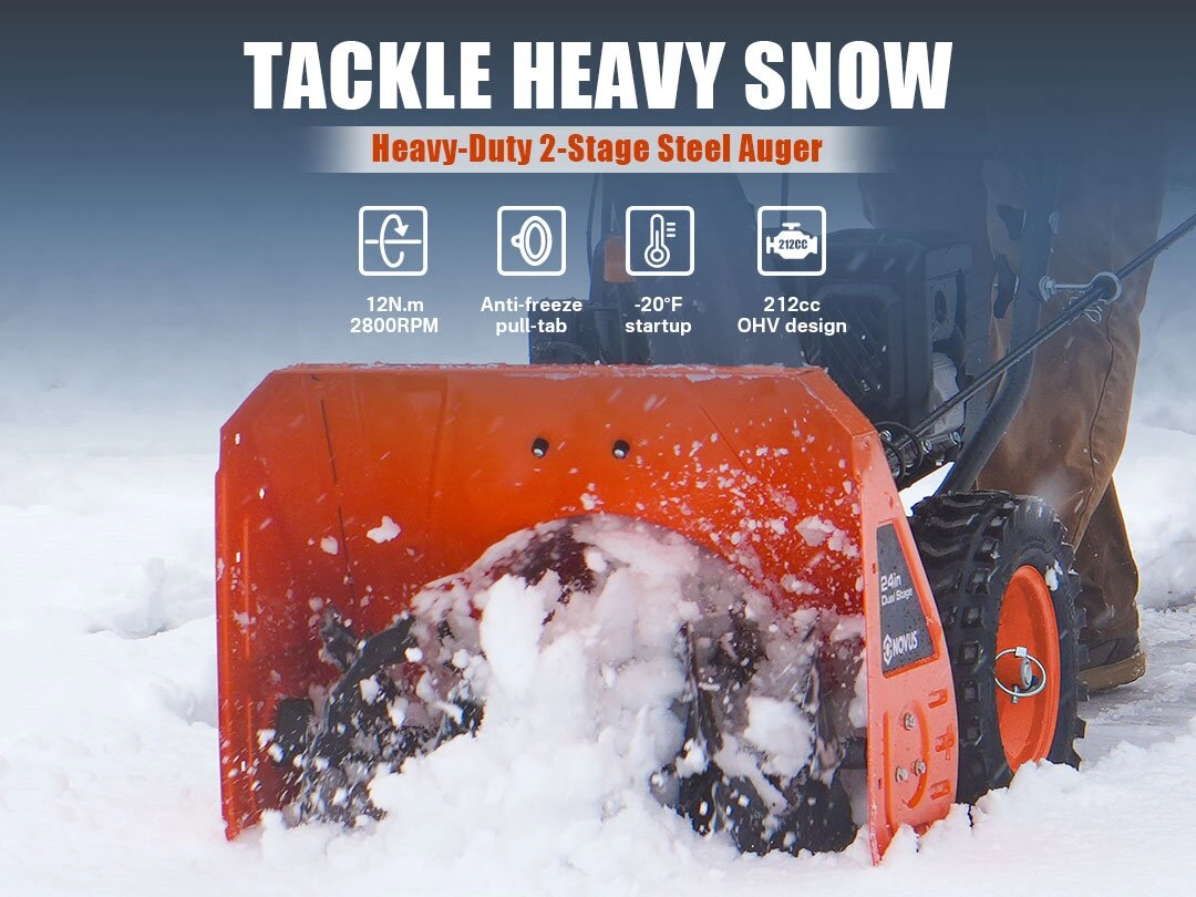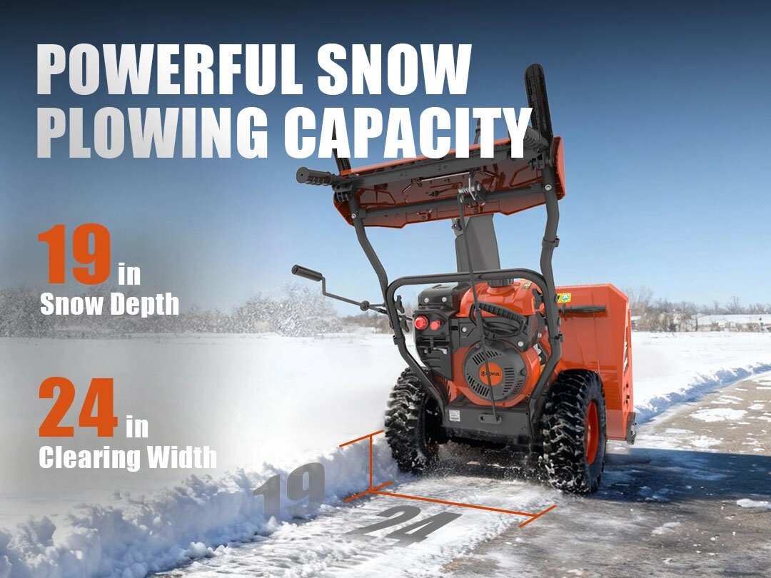 Powered by a 212cc OHV engine with a heavy-duty two-stage system, this snow blower delivers strong performance for demanding snow removal. Featuring a 24-inch clearing width, 19-inch intake height, and the ability to throw snow up to 40 feet, it is ideal for double-car driveways, large residential areas, and handling deep, wet, or compacted snow efficiently.