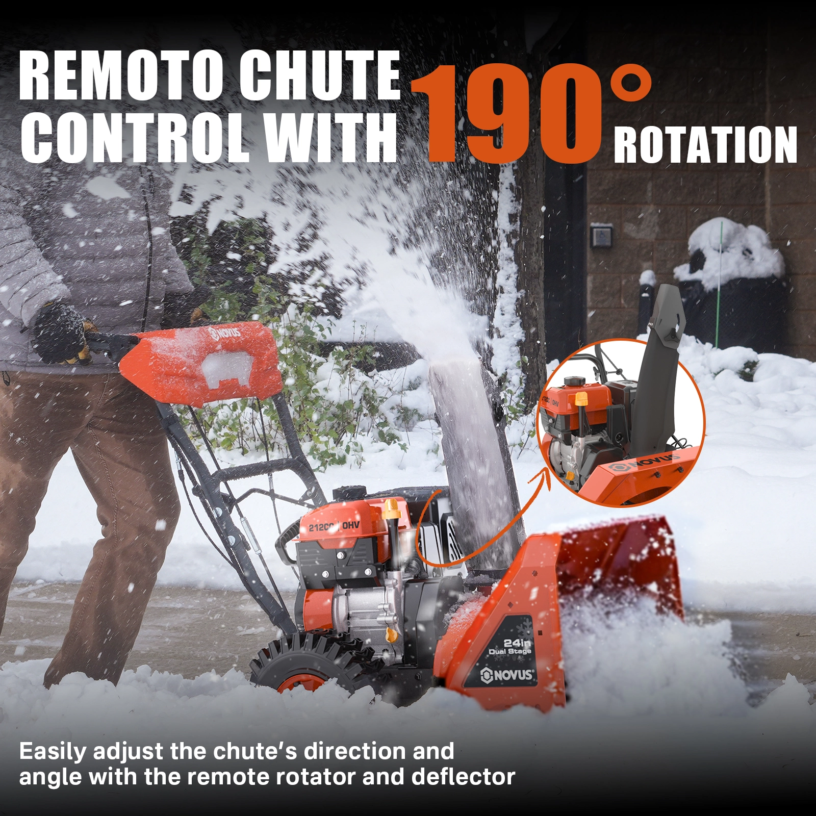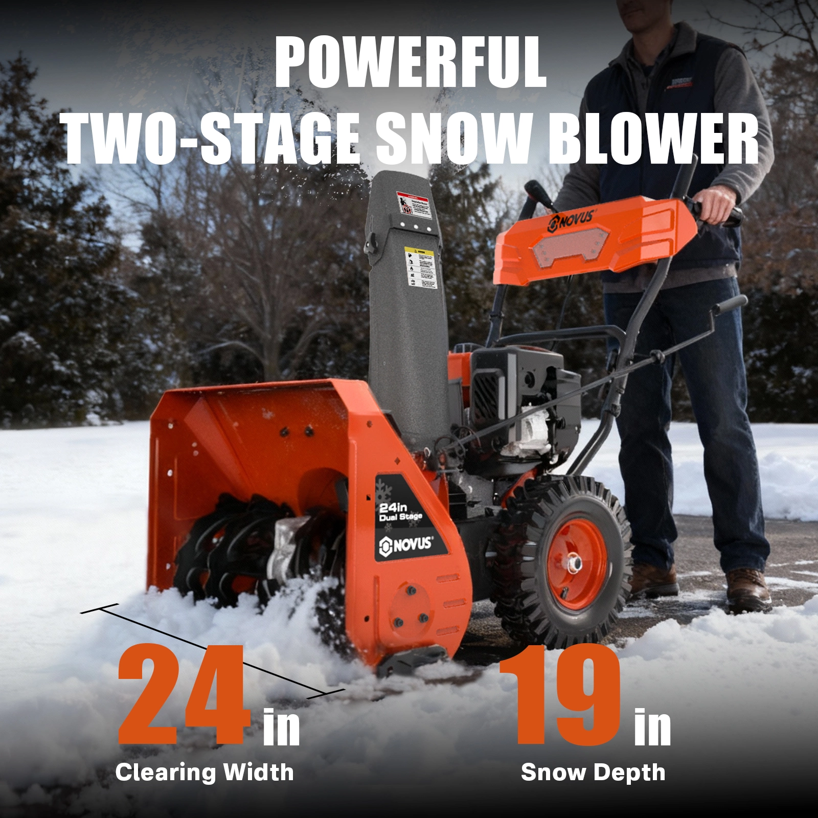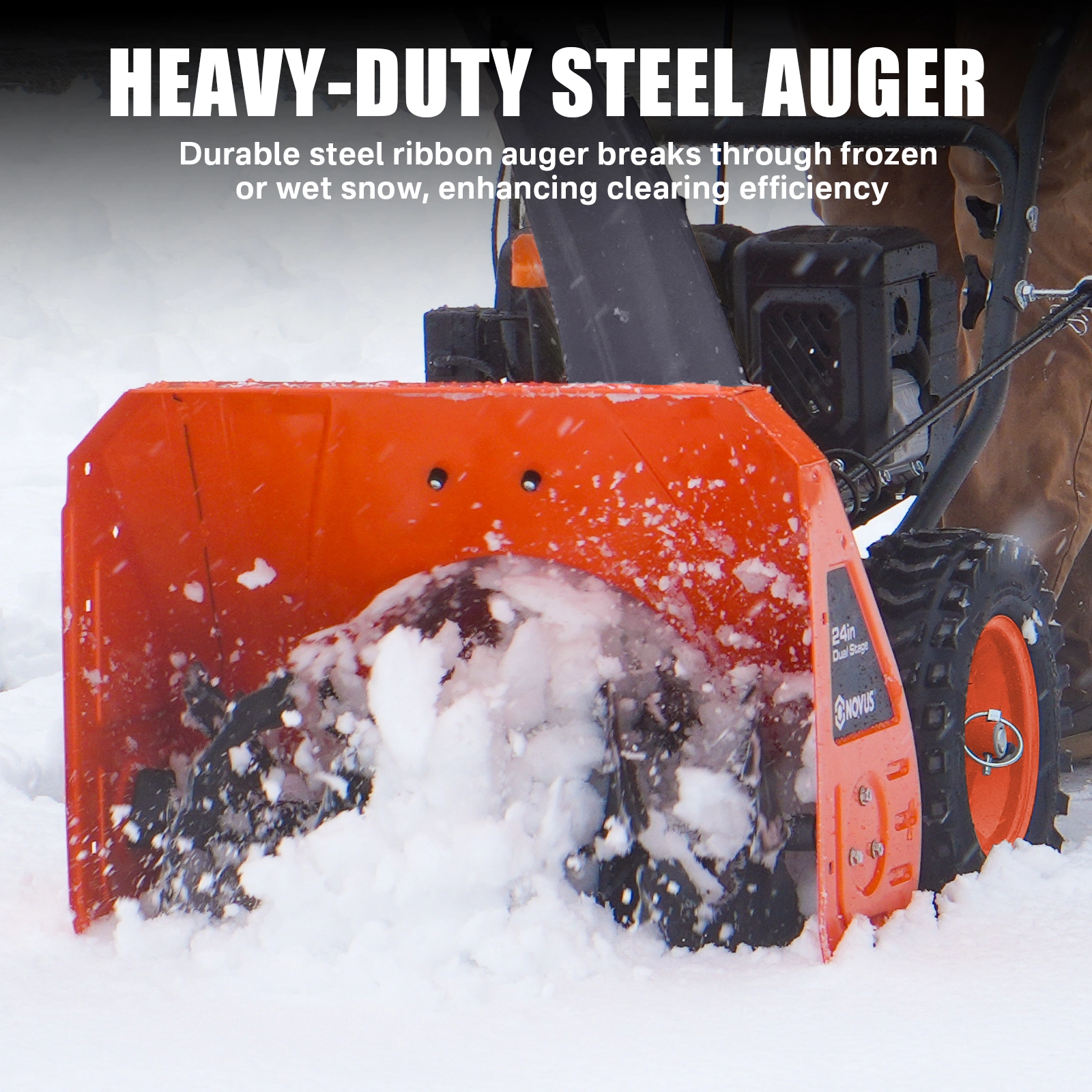 Powered by a 212cc OHV engine with a heavy-duty two-stage system, this snow blower delivers strong performance for demanding snow removal. Featuring a 24-inch clearing width, 19-inch intake height, and the ability to throw snow up to 40 feet, it is ideal for double-car driveways, large residential areas, and handling deep, wet, or compacted snow efficiently.