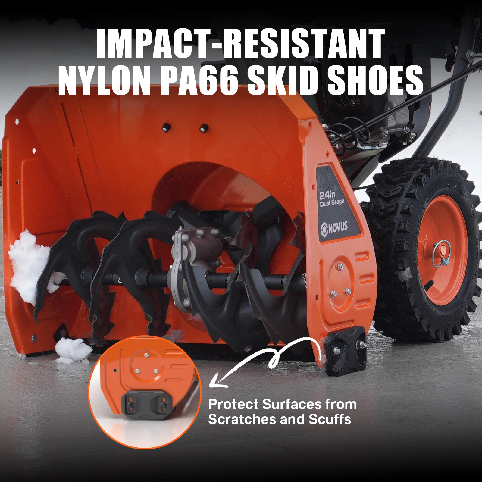 The gas powered snow blower is equipped with 13″ pneumatic snow terrain tires that offer excellent traction on various surfaces, including gravel and concrete, ensuring stability and control in any condition. High-impact, adjustable skid shoes protect surfaces from scuffing.