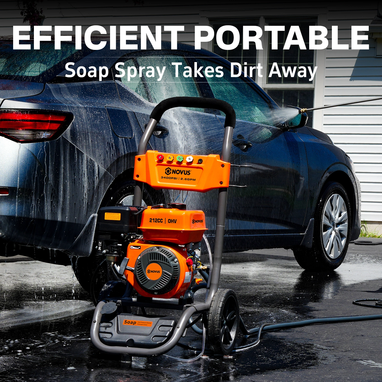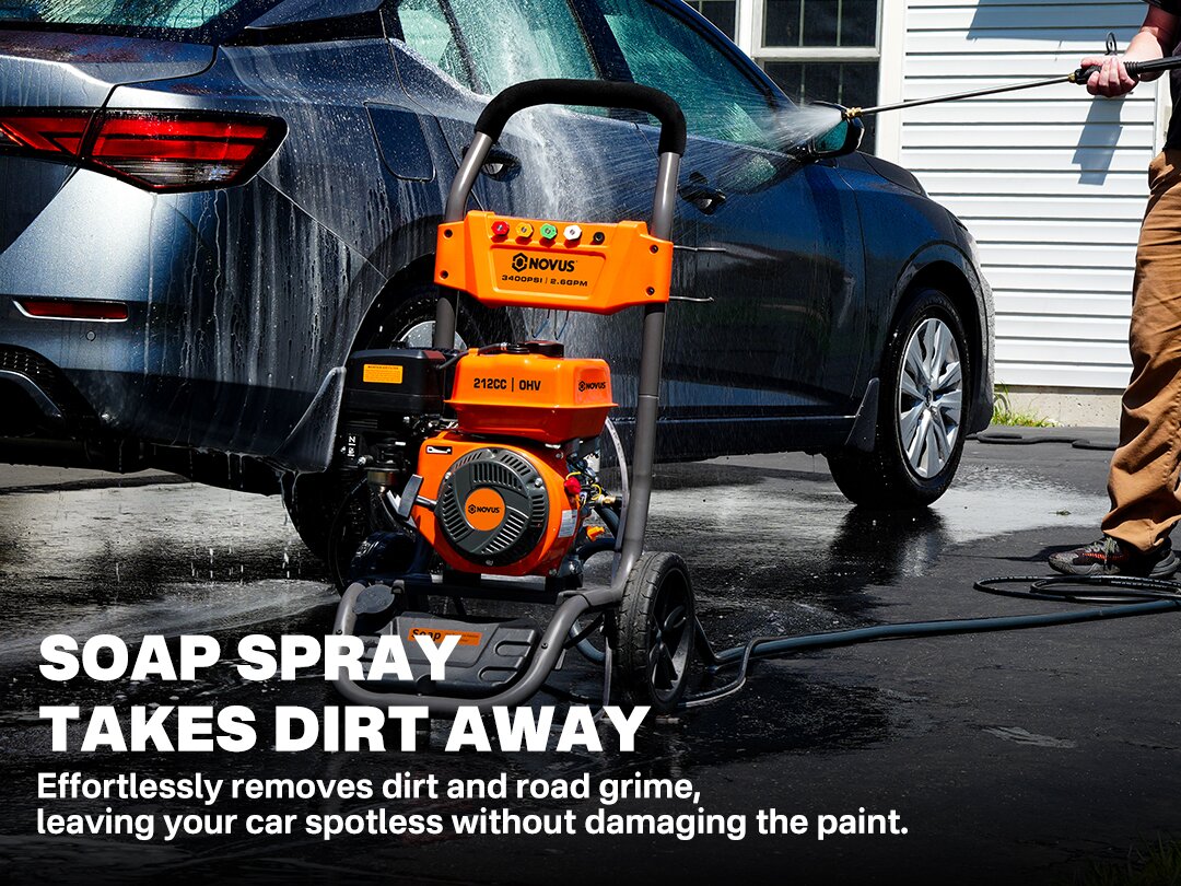 This gas power washer delivers an impressive 3400 PSI & 2.6 GPM, combining strong water pressure with high flow for deep cleaning. It features a convenient 0.79-gallon gas tank for easy refueling and a built-in 0.53-gallon soap tank for added efficiency.