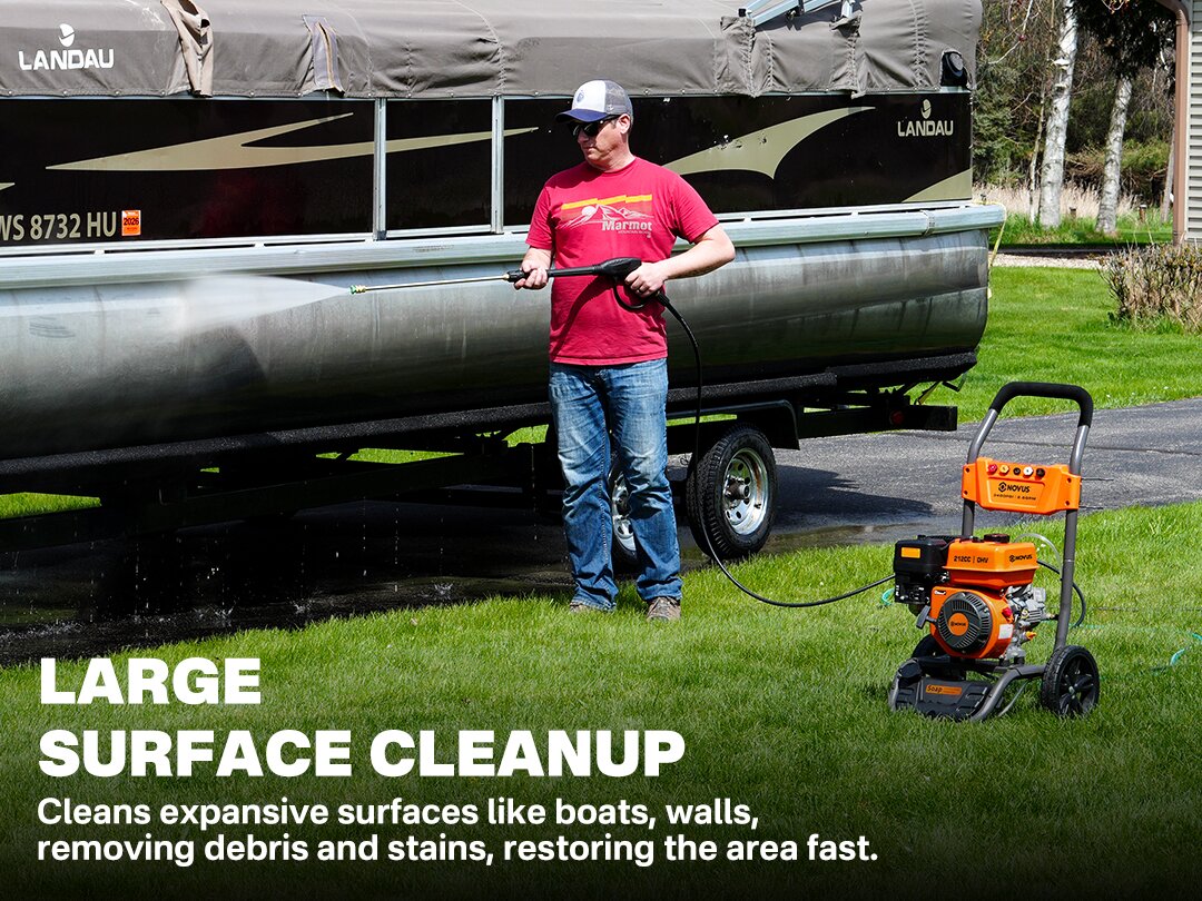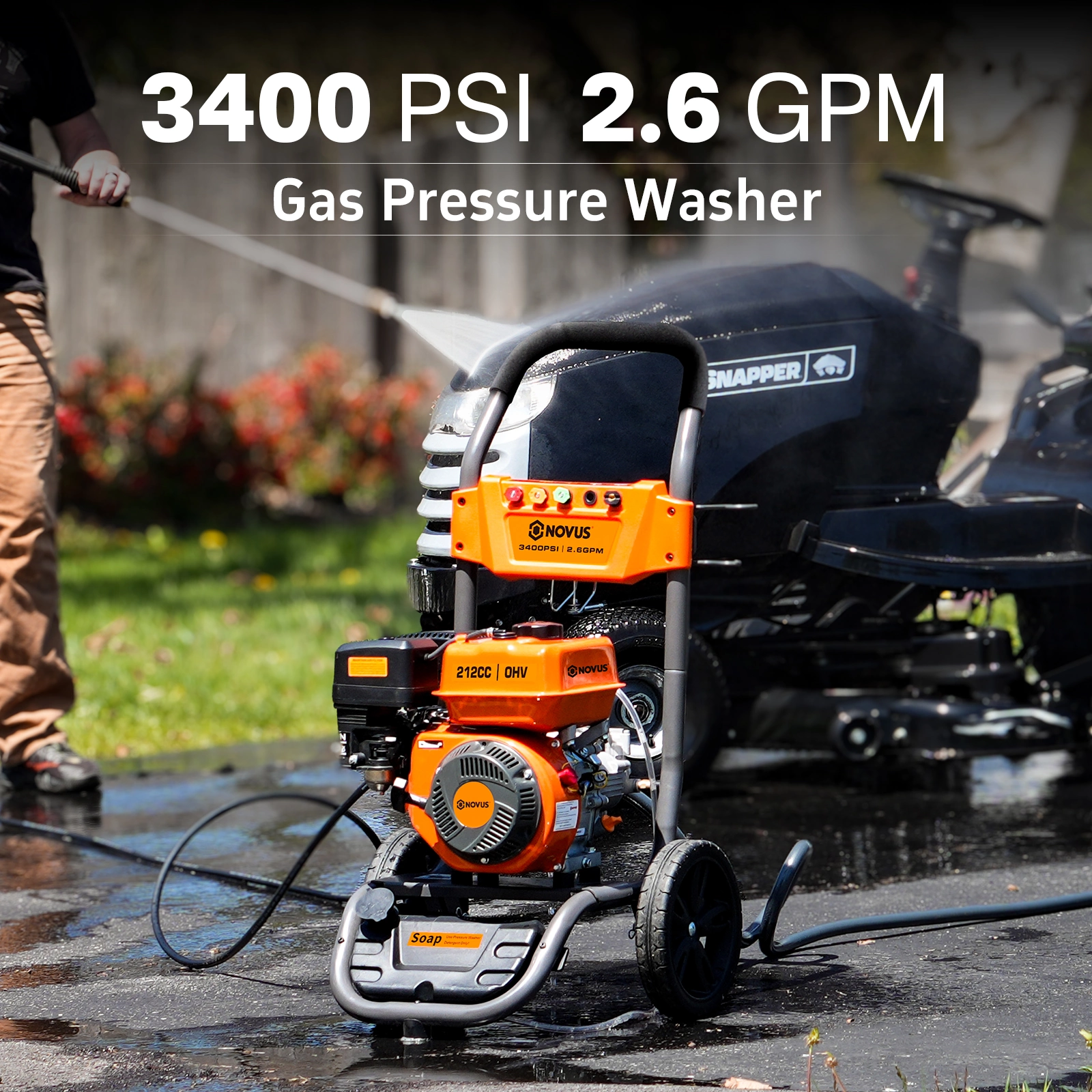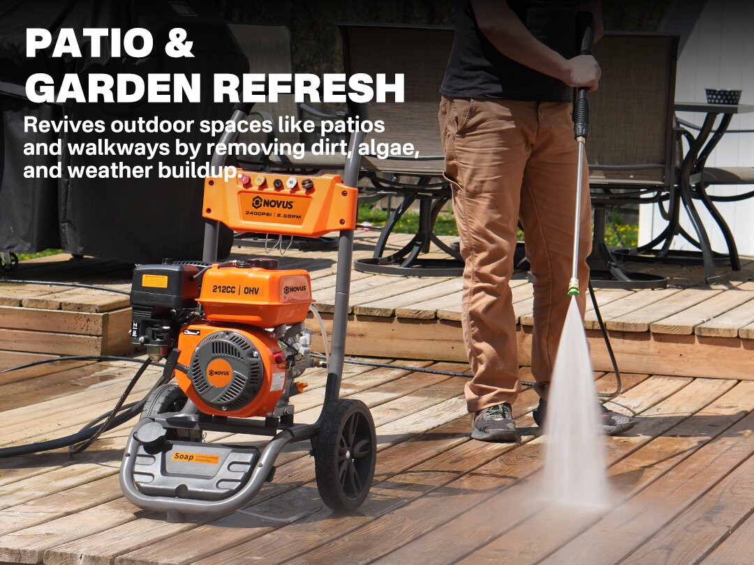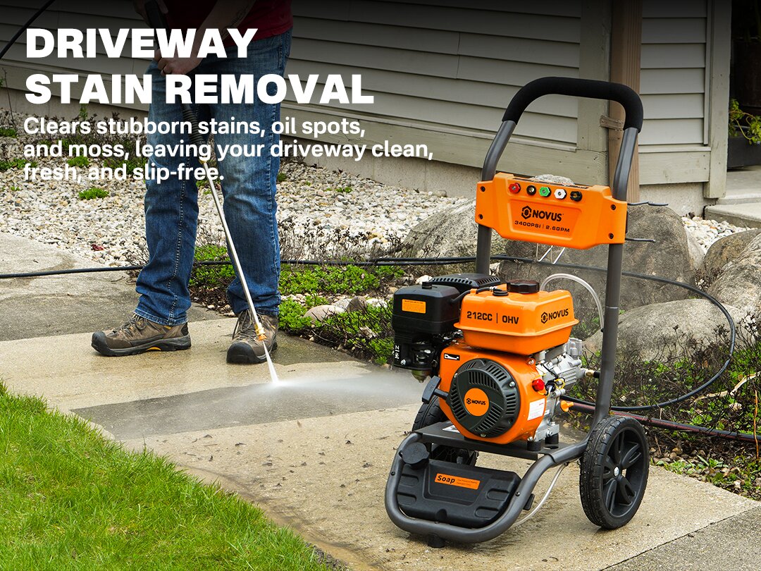This gas power washer delivers an impressive 3400 PSI & 2.6 GPM, combining strong water pressure with high flow for deep cleaning. Perfect for decks, driveways, fences, siding, cars, and patio furniture.
