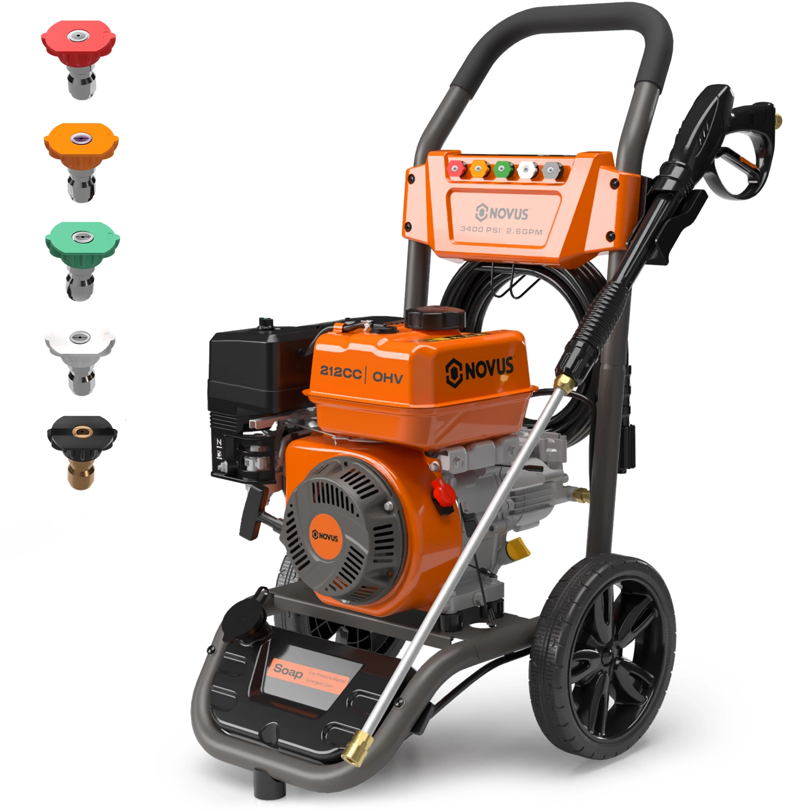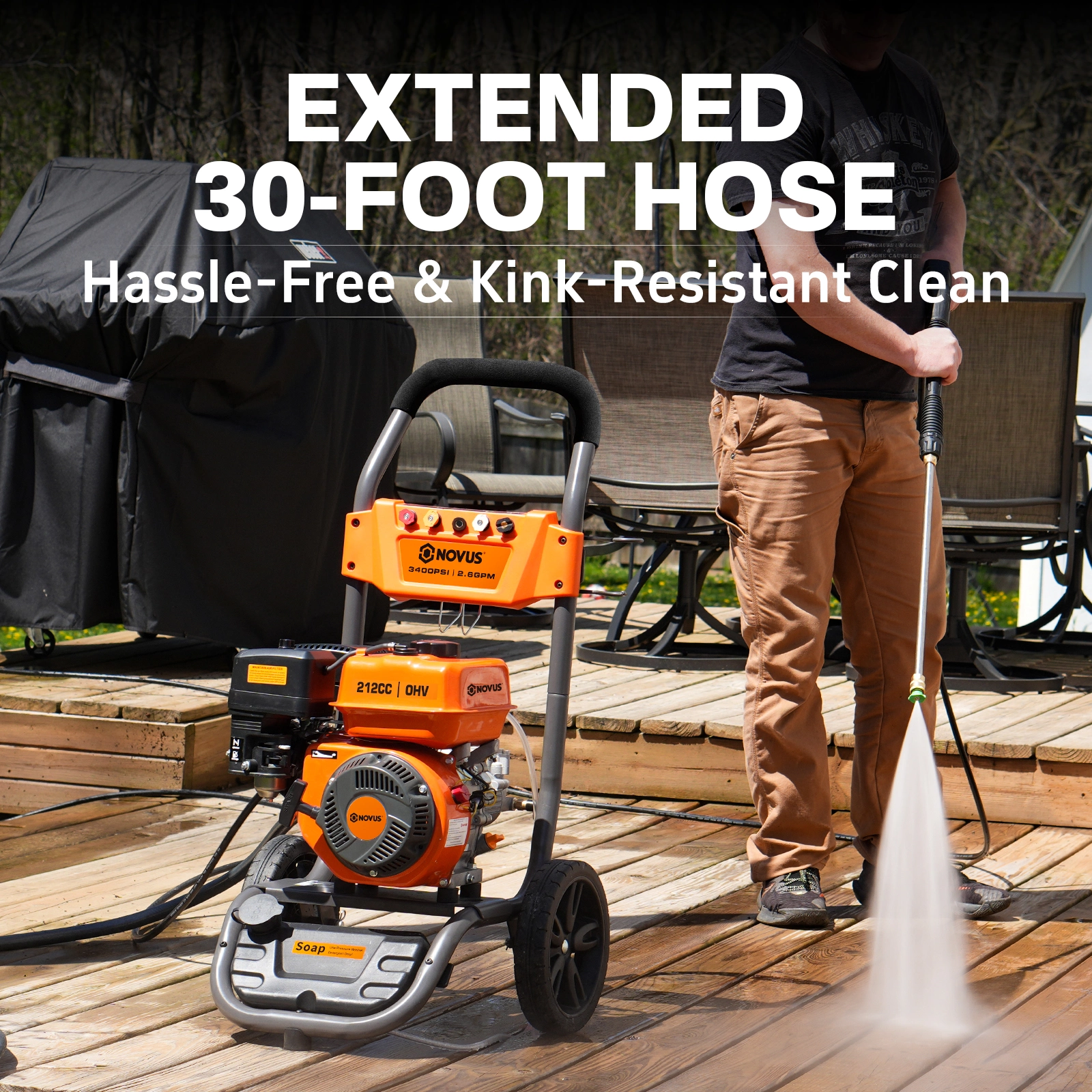 Equipped with a 30ft abrasion-resistant extra-long hose for extended reach and flexibility, 5 quick-connect nozzles (0°, 15°, 25°, 40° & Soap) and a lightweight high-pressure spray gun to ensure this gas powered pressure washer efficient multi-surface cleaning.